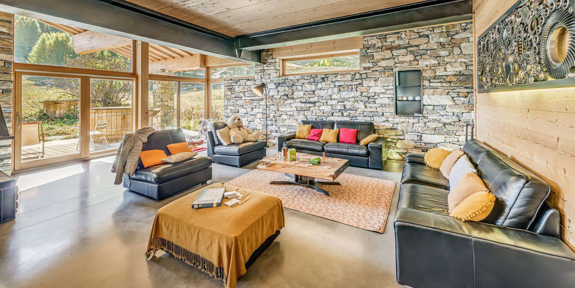 - South-facing living room with armchairs and benches, 1 TV, 360-degree fireplace, large bay windows, access to the south-facing terrace