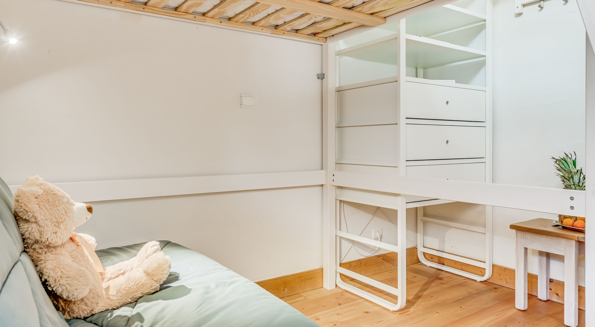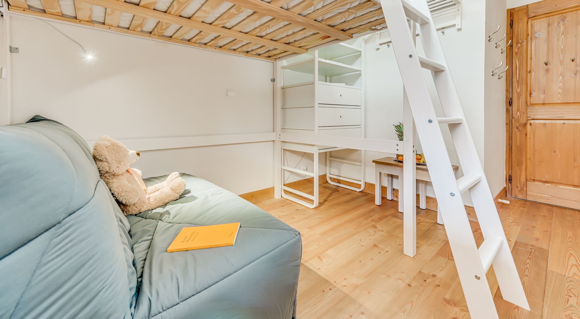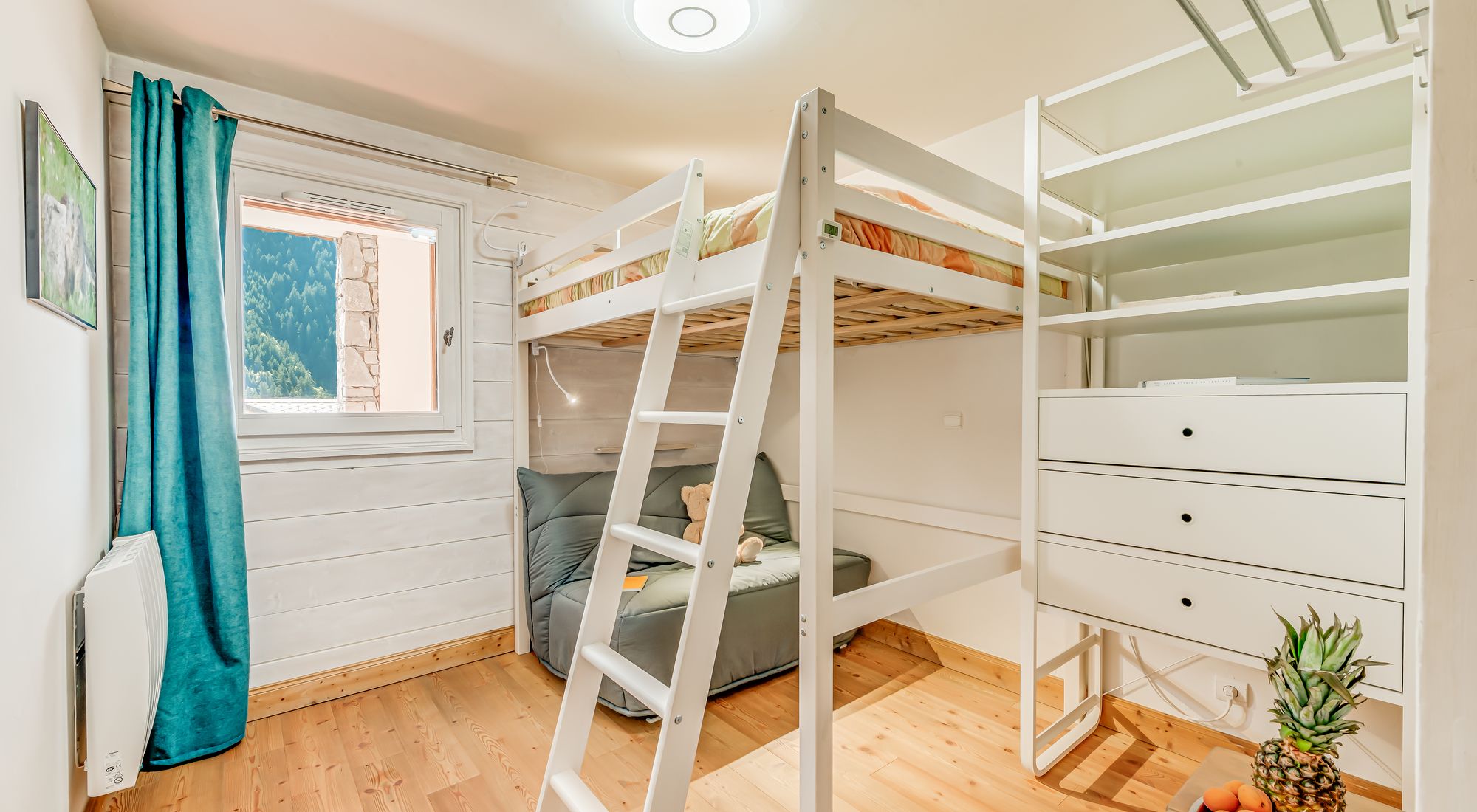 - Chambre 1 exposée SUD avec 1 lit double mezzanine, 1 canapé lit BZ, placard de rangement (4 couchages)