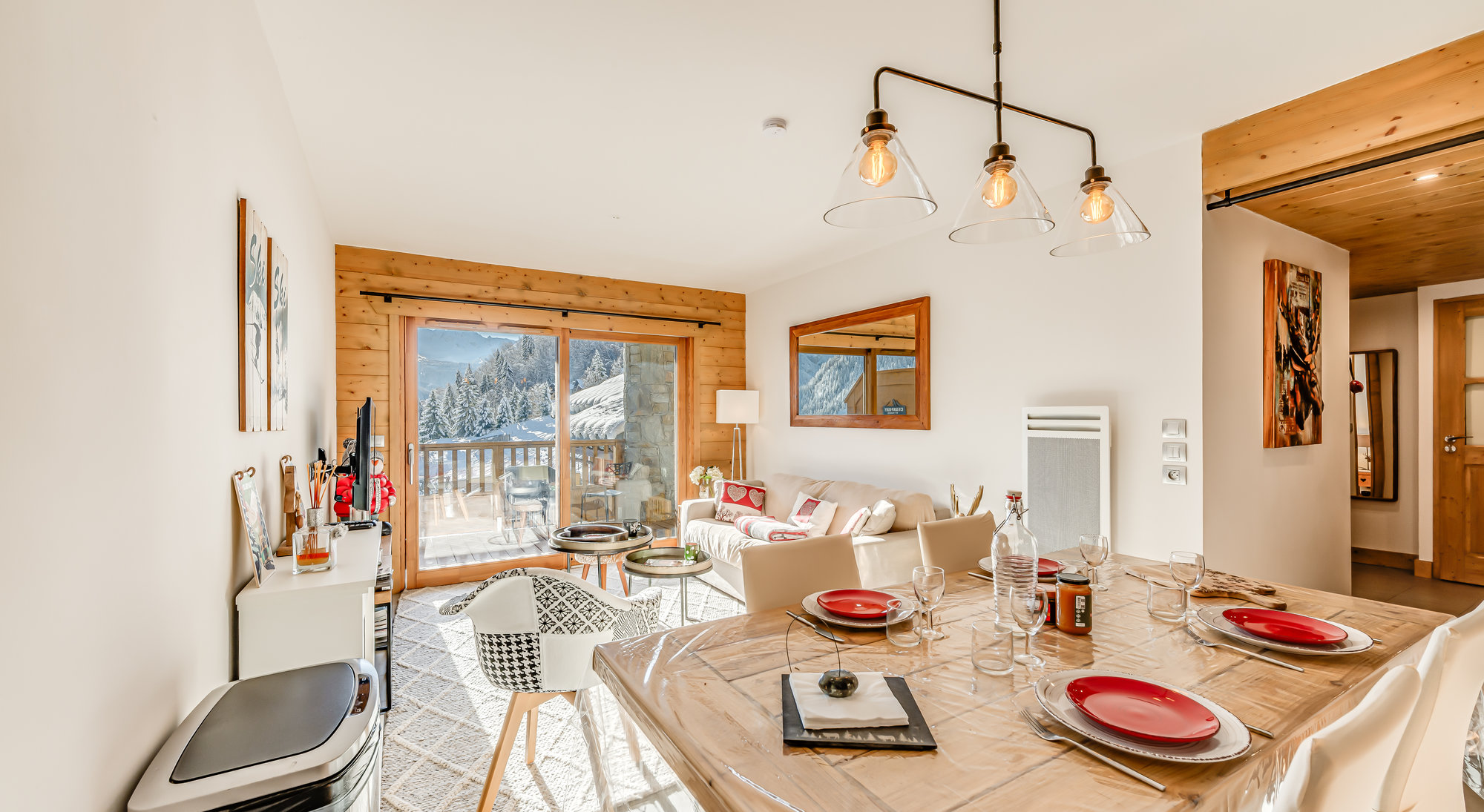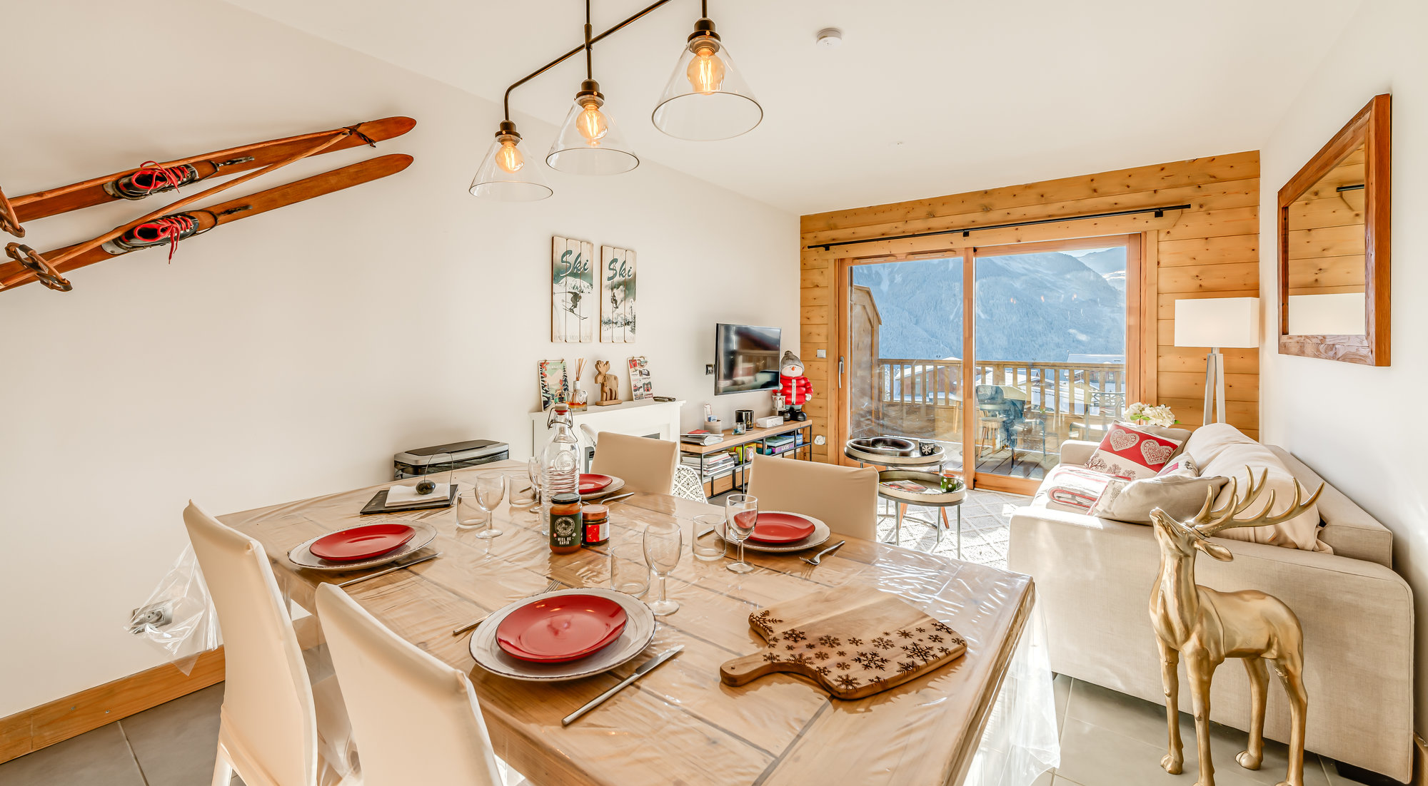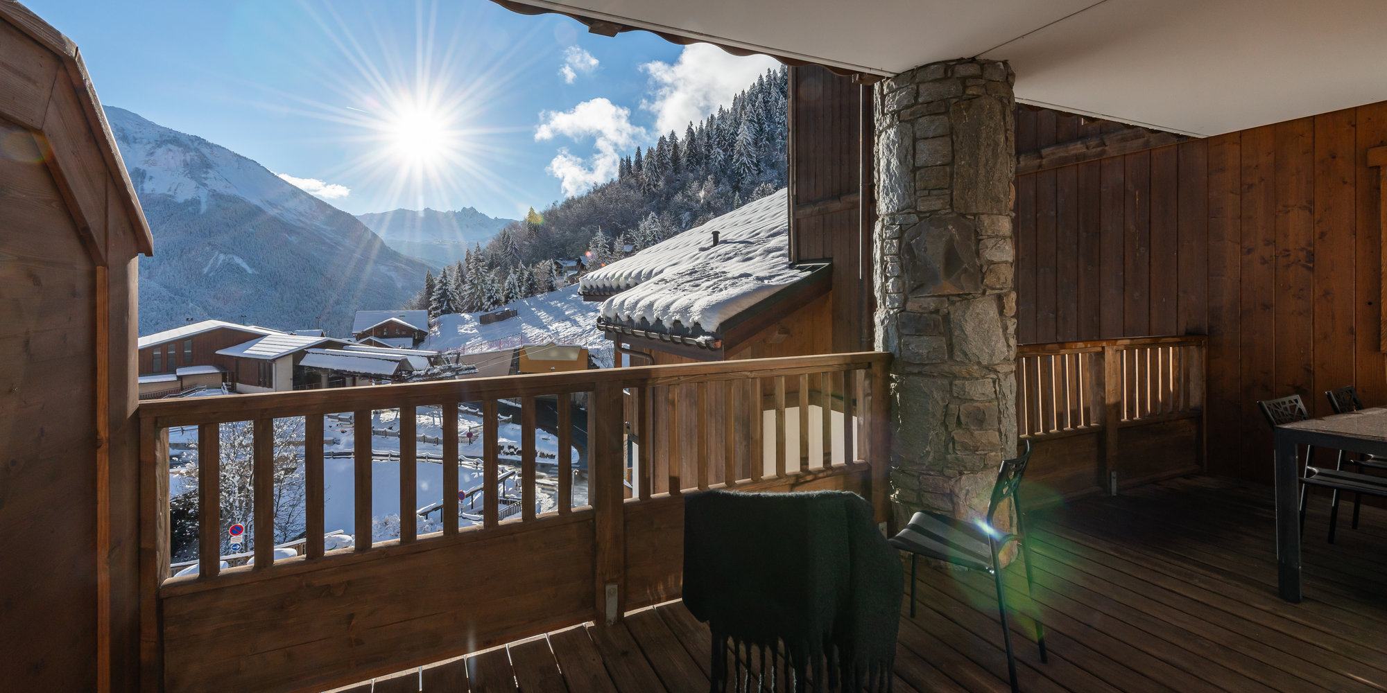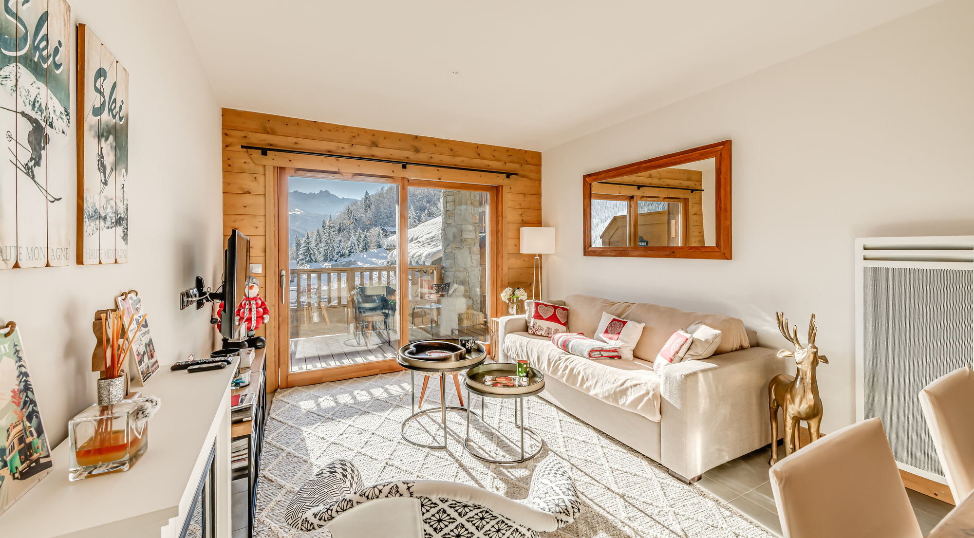 Il est composé d’un séjour avec balcon orienté Sud, d’une cuisine complètement équipée avec coin repas, de 2 chambres indépendantes, d’une salle de bains avec toilettes séparées et d’une salle de douche avec toilettes, d’une grande terrasse de 12 m2 totalement aménagée avec vue sur les montagnes et Courchevel.