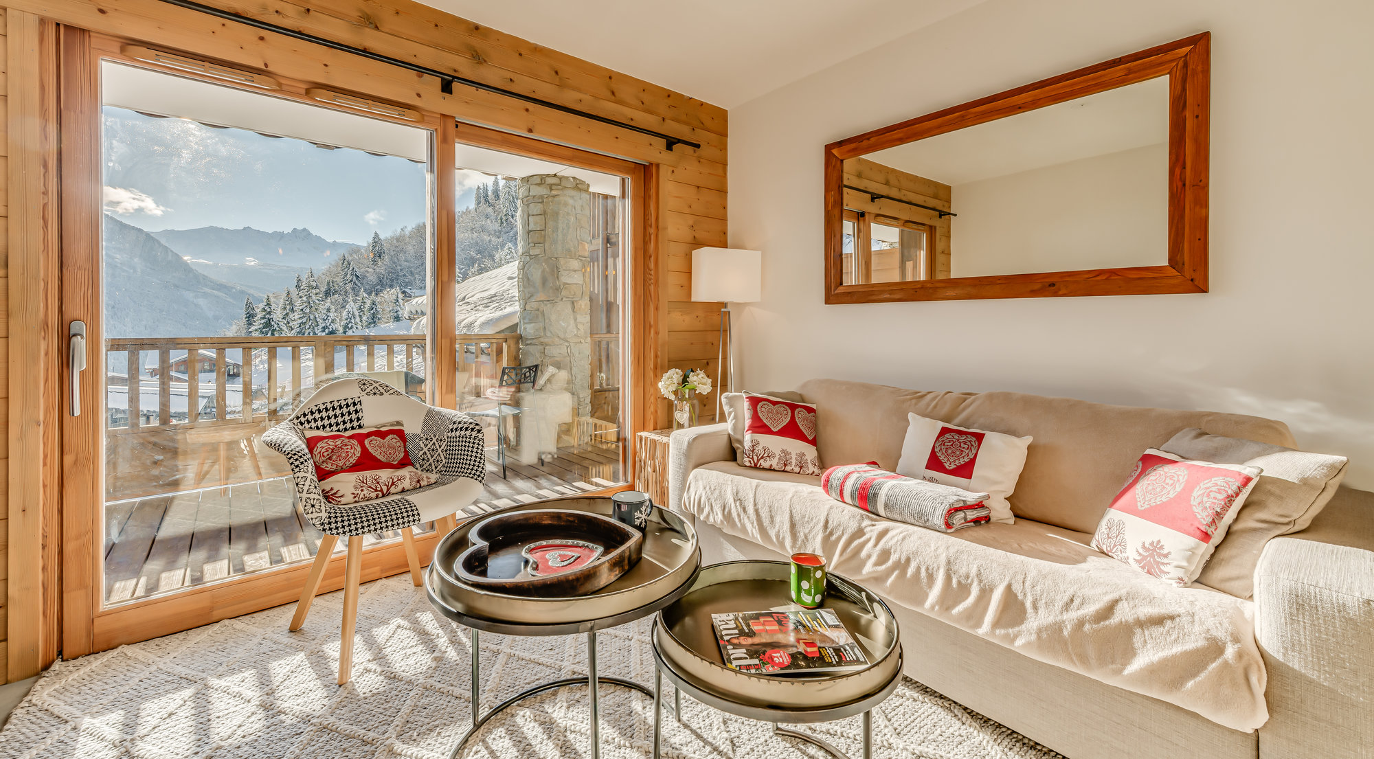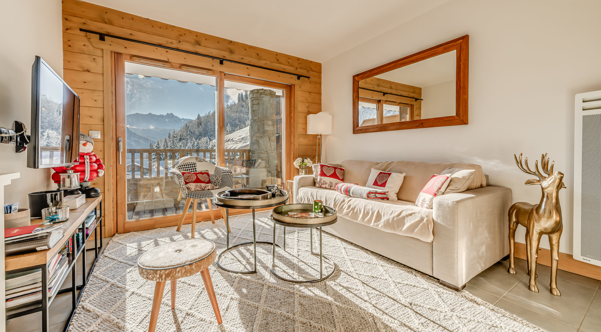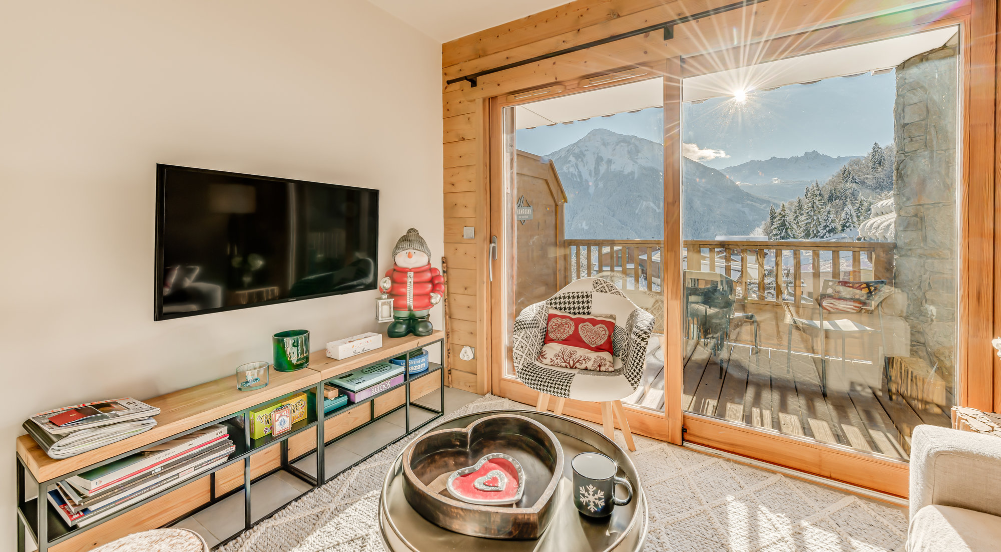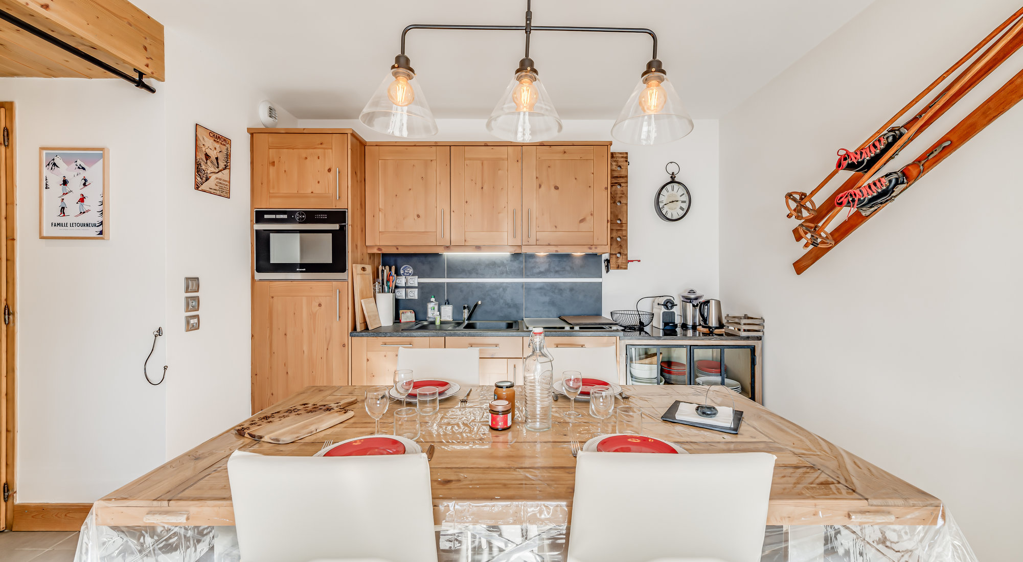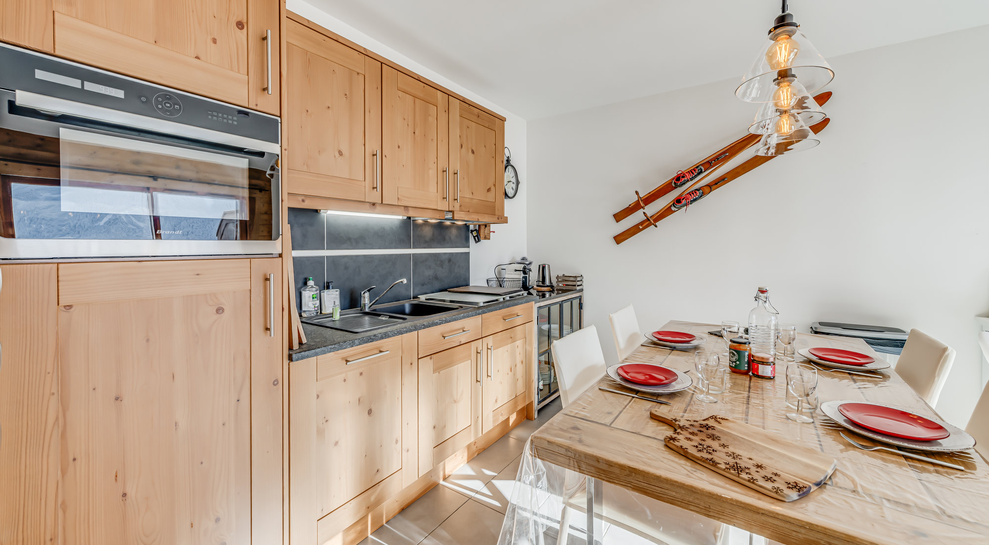 Il est composé d’un séjour avec balcon orienté Sud, d’une cuisine complètement équipée avec coin repas, de 2 chambres indépendantes, d’une salle de bains avec toilettes séparées et d’une salle de douche avec toilettes, d’une grande terrasse de 12 m2 totalement aménagée avec vue sur les montagnes et Courchevel.