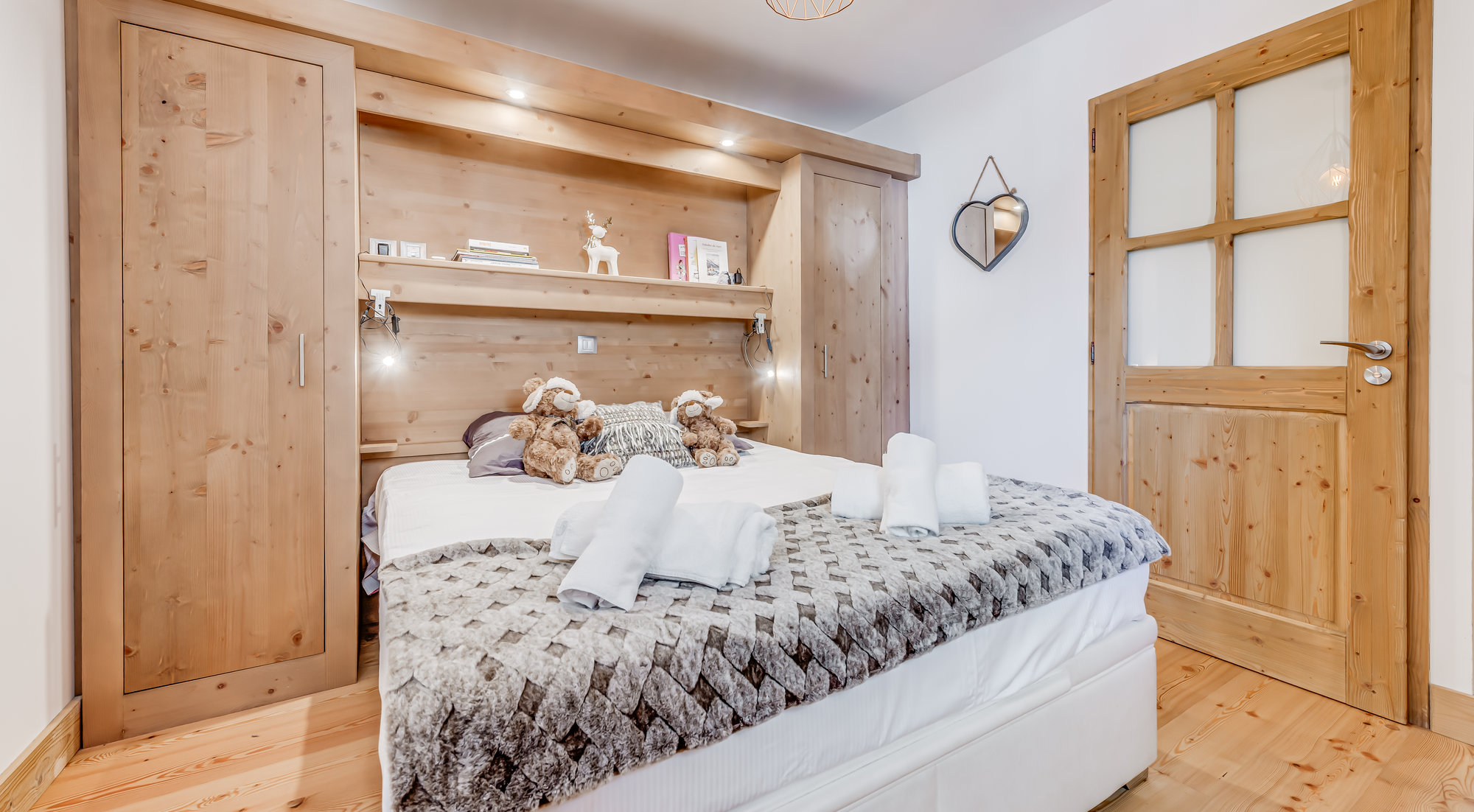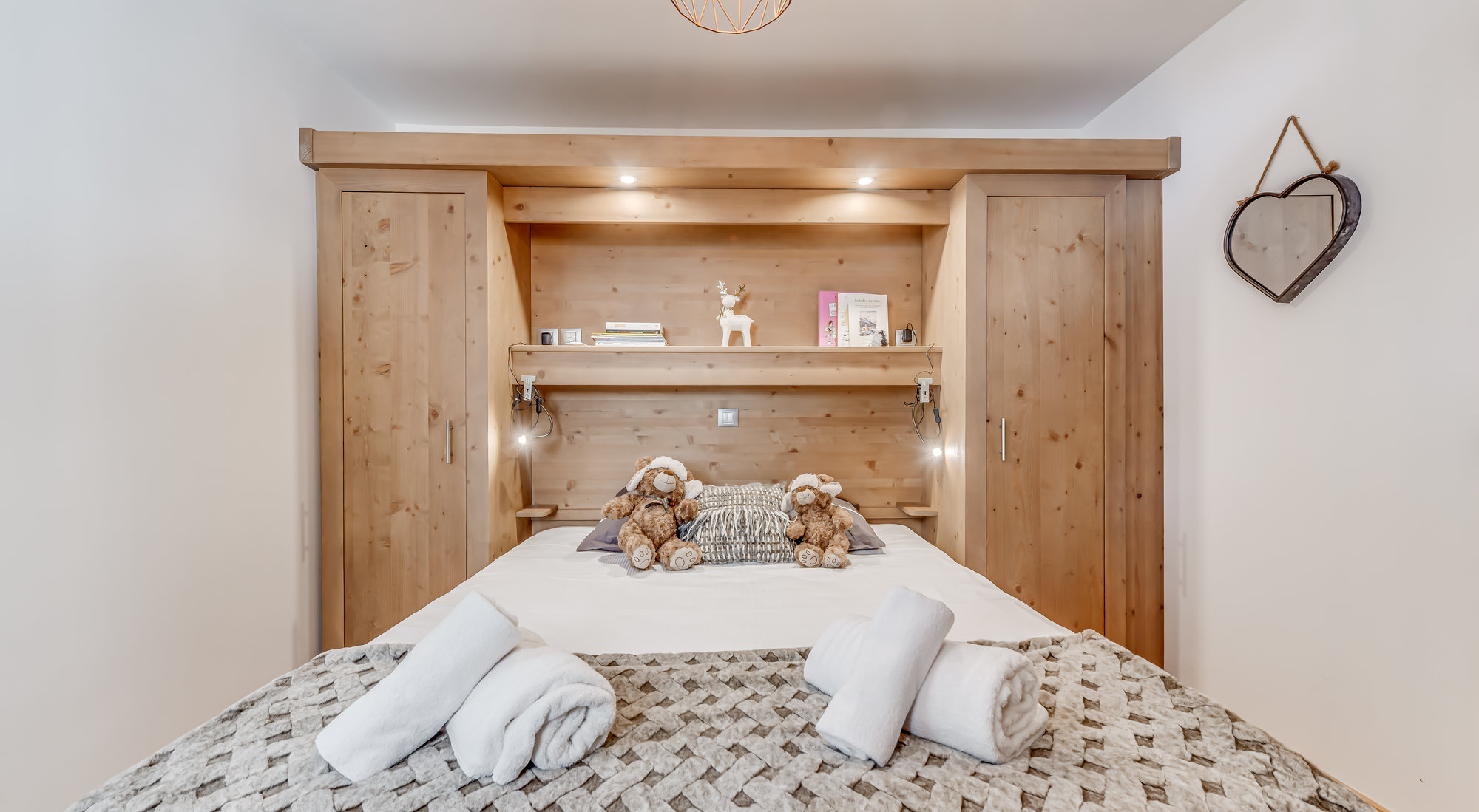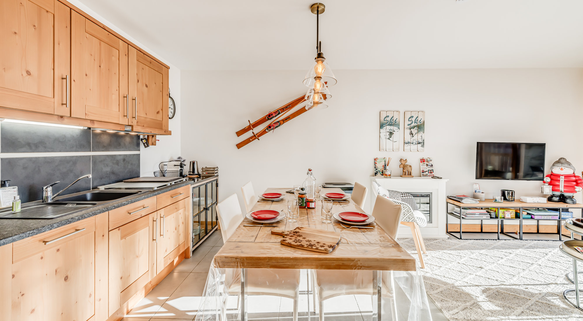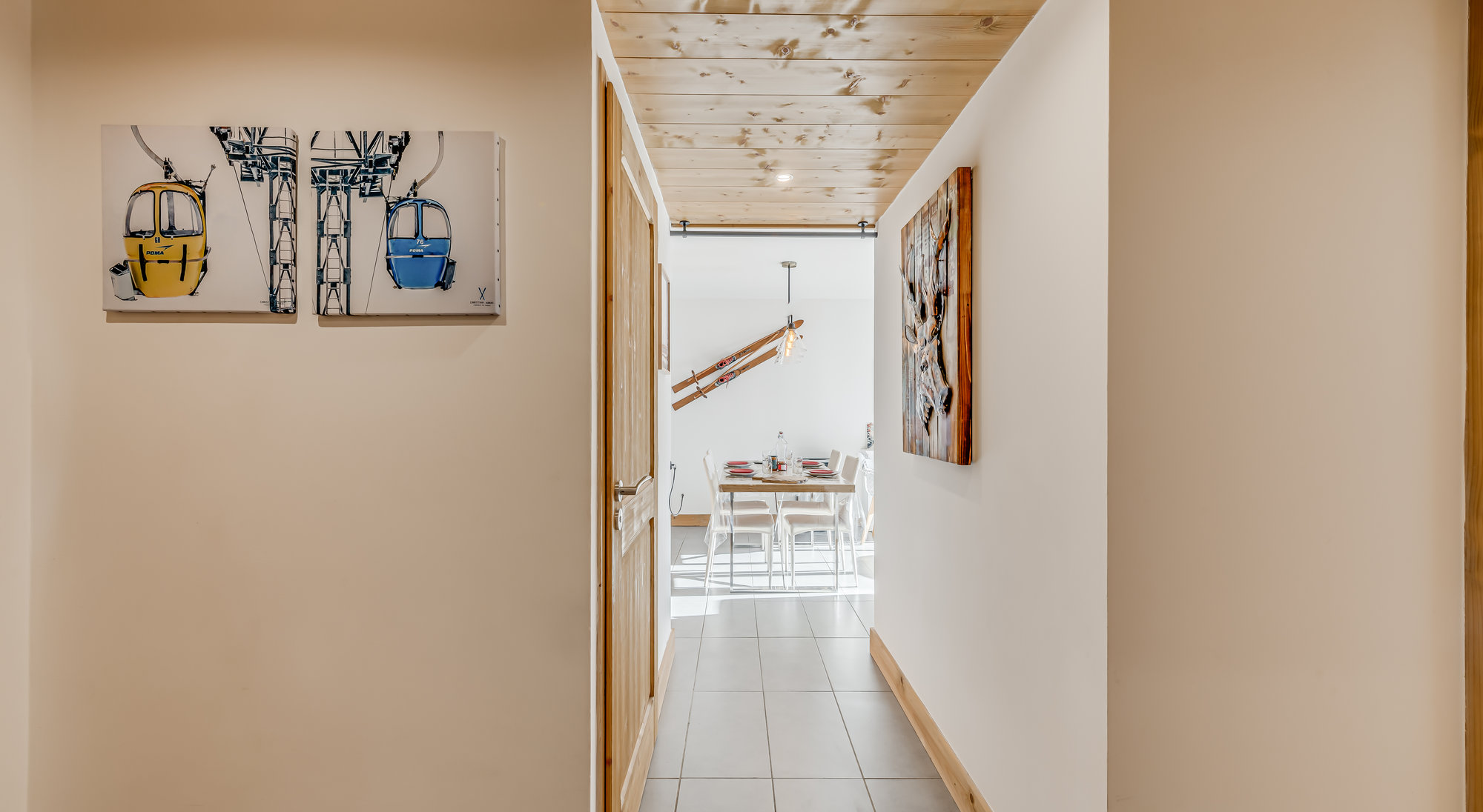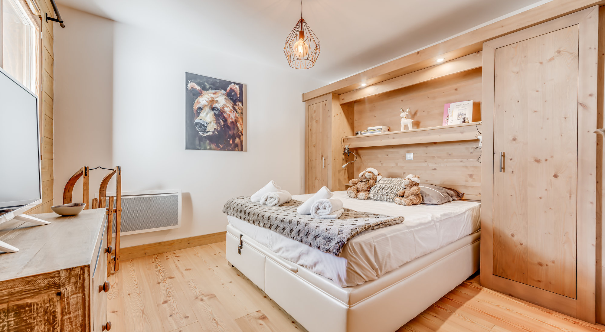 Il est composé d’un séjour avec balcon orienté Sud, d’une cuisine complètement équipée avec coin repas, de 2 chambres indépendantes, d’une salle de bains avec toilettes séparées et d’une salle de douche avec toilettes, d’une grande terrasse de 12 m2 totalement aménagée avec vue sur les montagnes et Courchevel.