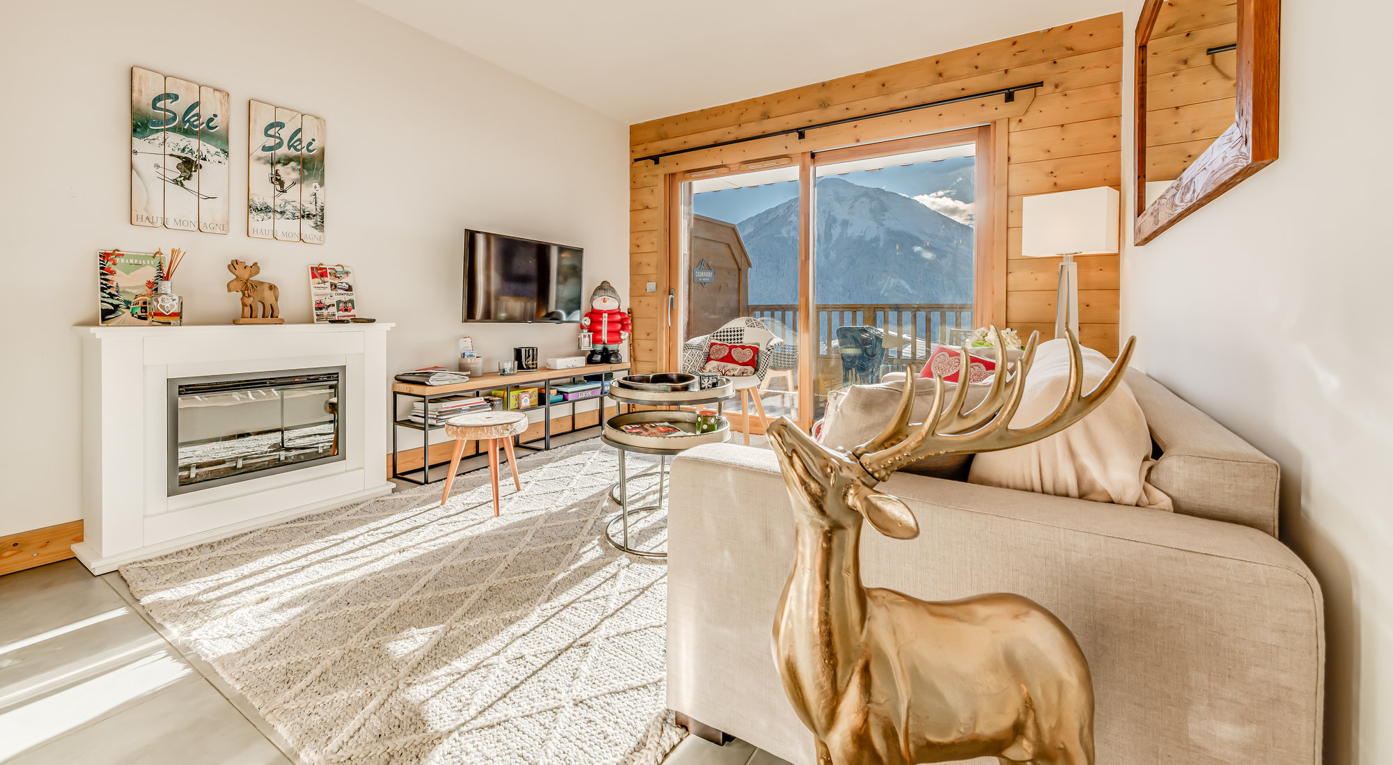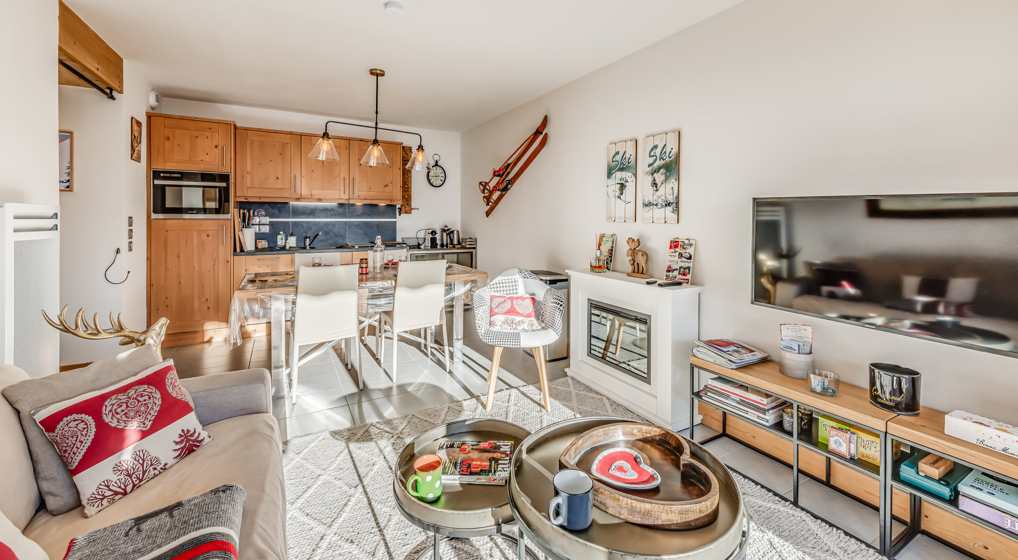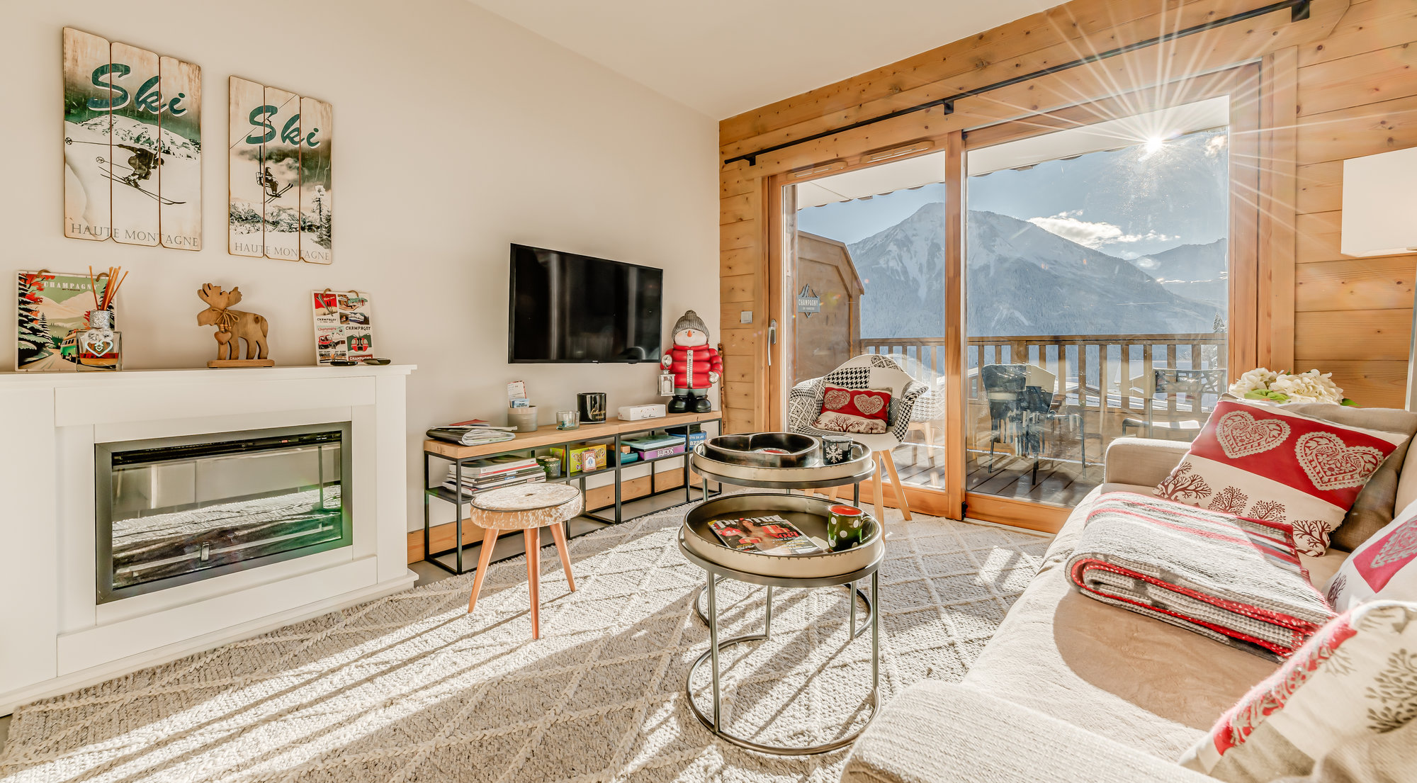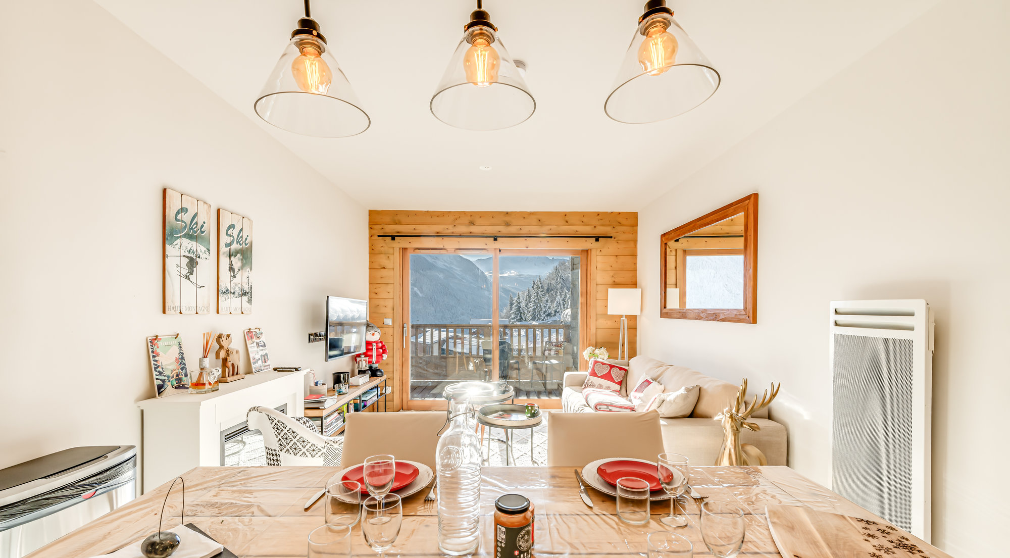 * Séjour  : coin repas avec une table et chaises, un canapé lit convertible (couchage 140x200), table basse, meuble avec écran plat connecté à Internet en wifi et cheminée électrique. Fenêtre coulissante avec access au balcon aménagé plein Sud.